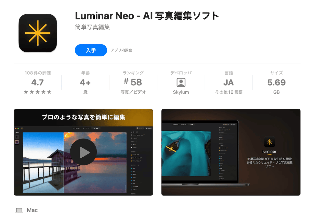 Mac App Storeで提供されているAdobe Lightroomは、macOS向けに最適化された写真管理アプリです。プロユーザーからの支持も厚く、豊富な機能を搭載しています。