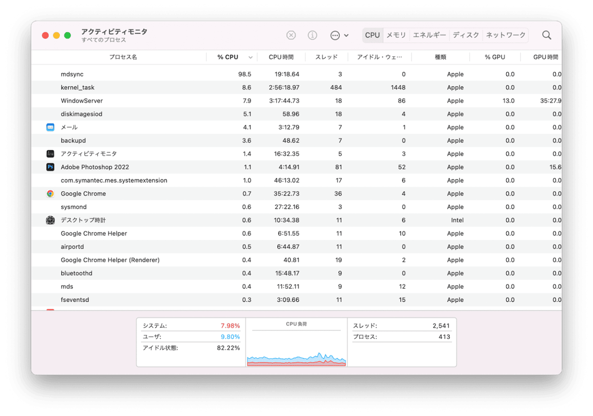 また、%CPUでソートしたアプリの中で、終了させてはいけないシステム上のプロセスが混ざっているかもしれません。適切にアプリのプロセスを終了させることに自信が無い場合は、次に示す「自動的に終了させる方法」を実施してください。