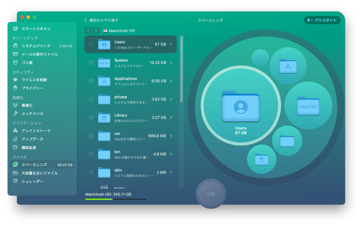 Macの中には膨大な数のファイルが眠っており、なかなか大容量のファイルを洗い出すのは難しいですね。CleanMyMacはスペースレンズの機能も付いているので、こちらを使うと良いでしょう。スペースレンズとは、大きな容量のフォルダを可視化し、その中身を確認する機能です。