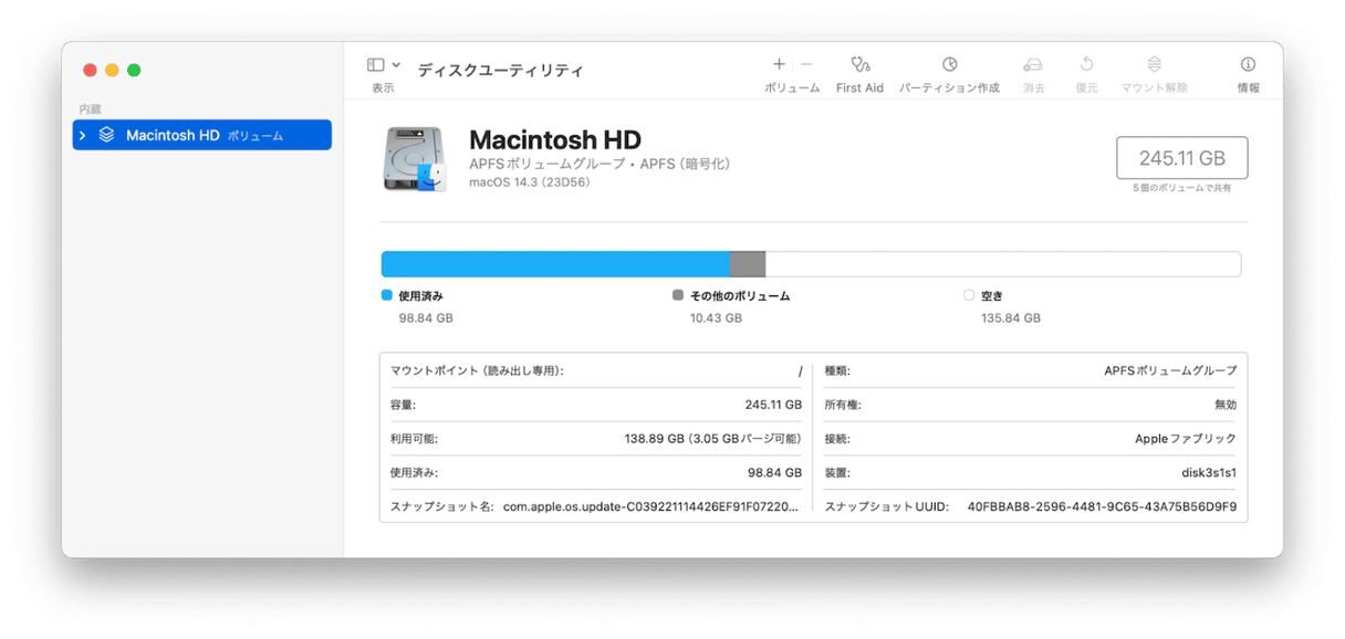 Macに標準で付いている機能によってパージ可能領域を削除できます。手順は以下の通りです。