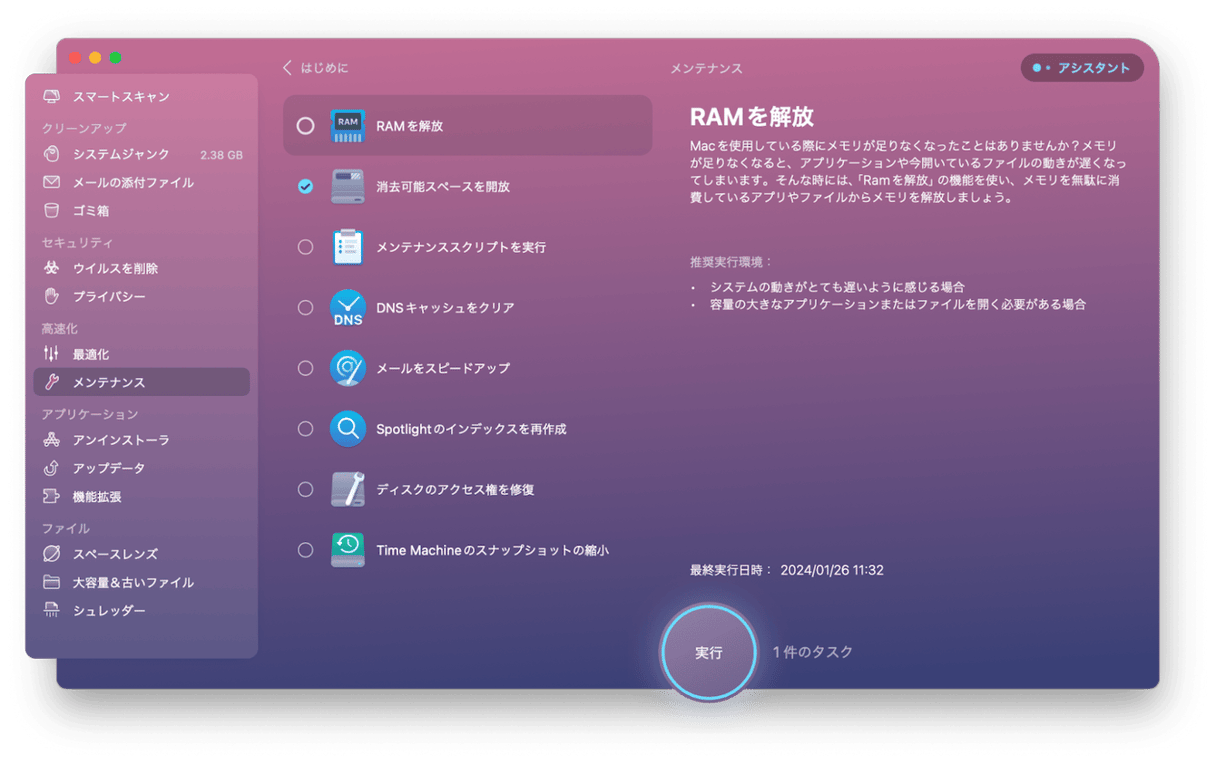 CleanMyMacはApple公証のクリーンアップアプリです。このアプリには「消去可能スペースを開放」という機能があります。これはMacの管理機能よりも多くの空き領域を確保できるのでおすすめです。