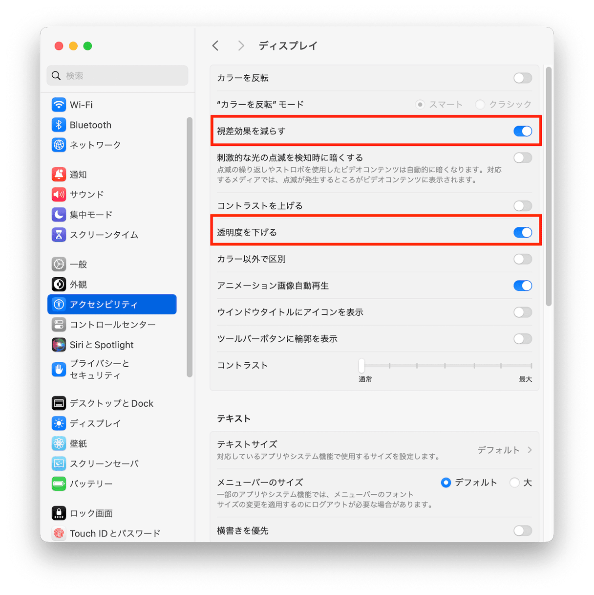 - 「視差効果を減らす」「透明度を下げる」にチェックを入れる