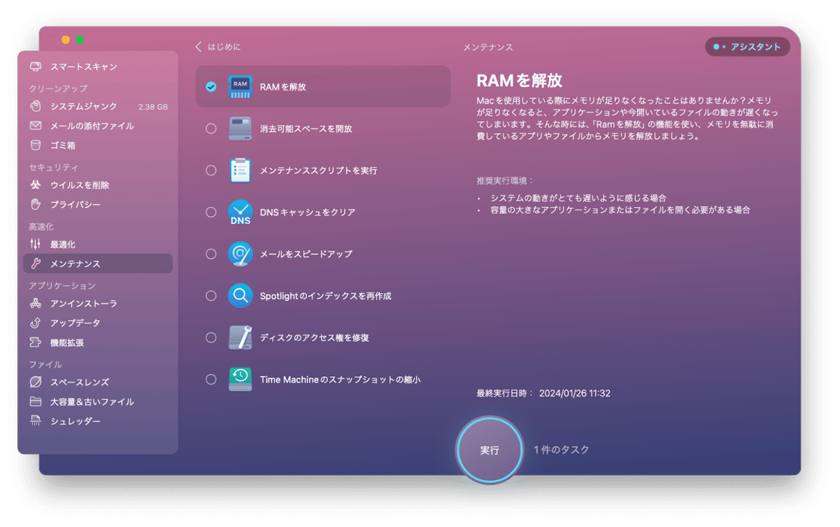 メモリが足りなくなると、アプリや現在開いているファイルの動きが遅くなってしまいます。そんな時は、最新のmacOSのMontereryに対応したCleanMyMacのメンテナンス機能の中にある「RAMを解放」の機能を使って、メモリを過剰に消費しているアプリやファイルからメモリを解放させましょう。
