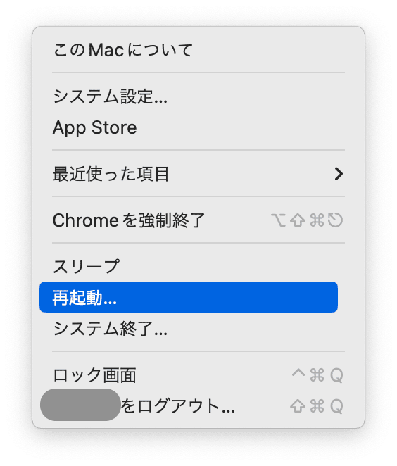 とりあえずMacを再起動してみましょう。一時ファイルが問題を引き起こしていたり、バックグラウンドのプロセスがハングアップしていたり、そのような一時的な問題は再起動によって解決するケースが多いです。