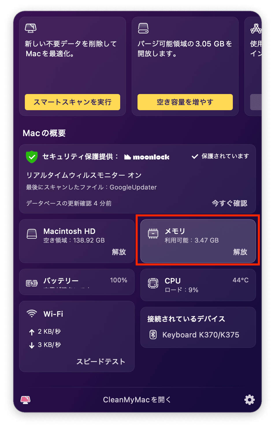 Macの画面の右上のバーに表示されるCleanMyMacのアイコンをクリックして、以下のヘルスモニターからメモリを解放することもできます。