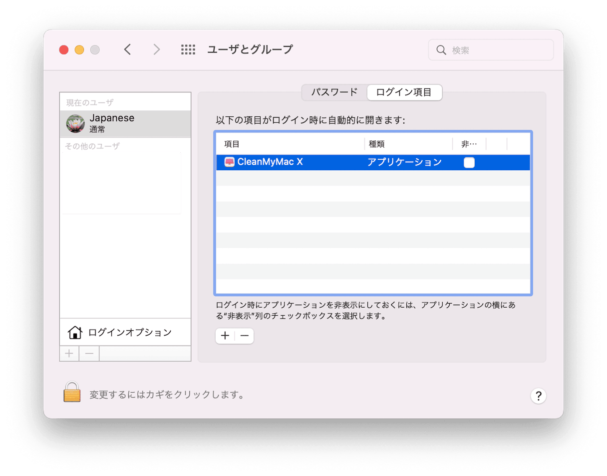 - ーザアカウントを選択して、ウインドウの上部にある「ログイン項目」をクリックします。