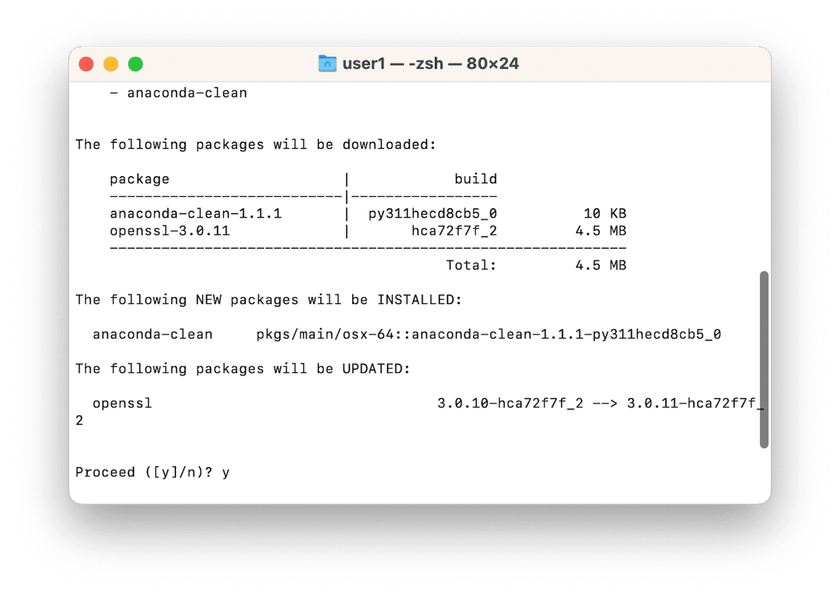 - 'anaconda-clean'というコマンドを入力し、エンターキーを押します。これにより、このアプリが生成したすべてのディレクトリやファイルが検索されます。