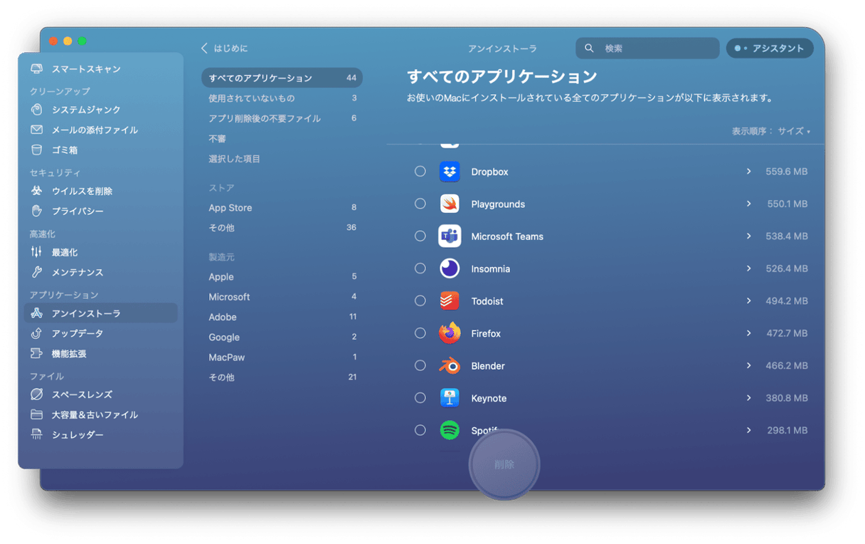 - アンインストールしたいアプリを選択し、「削除」をクリック