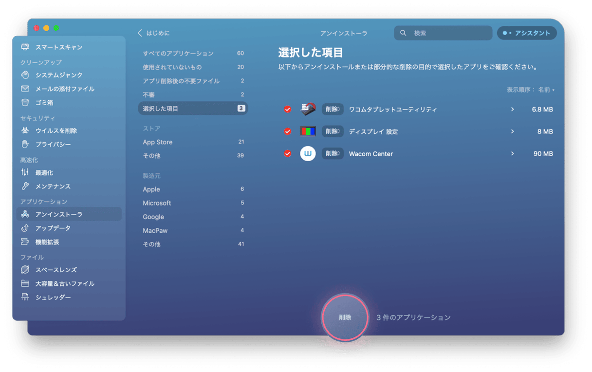 CleanMyMacは、全世界で累計1,500万回以上ダウンロードされていて、Apple公証も受けている人気のアプリです。これを利用してワコムをアンインストールする手順はこちらです: